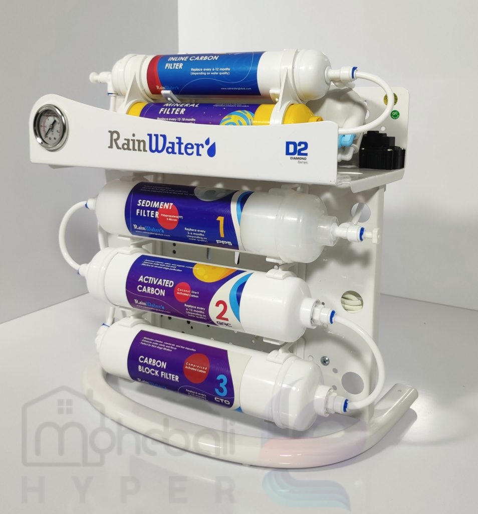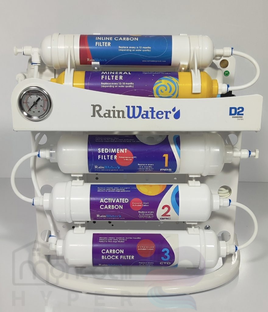تصفیه آب شش فیلتر رین واتر مدل D2 یک سیستم پیشرفته و کمجا است که به جای هوزینگهای بزرگ، فیلترها به صورت یکپارچه و کارتریجی نصب میشوند.