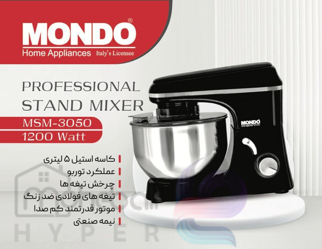 همزن کاسهدار موندو مدل MSM-3050 با توان ۱۲۰۰ وات و طراحی نیمهصنعتی، یک دستگاه حرفهای و پرقدرت برای آشپزخانههای مدرن است. این دستگاه با کاسه استیل ۵ لیتری و تیغههای فولادی ضدزنگ، بهترین انتخاب برای آمادهسازی خمیر، کیک، شیرینی و انواع دسر میباشد.